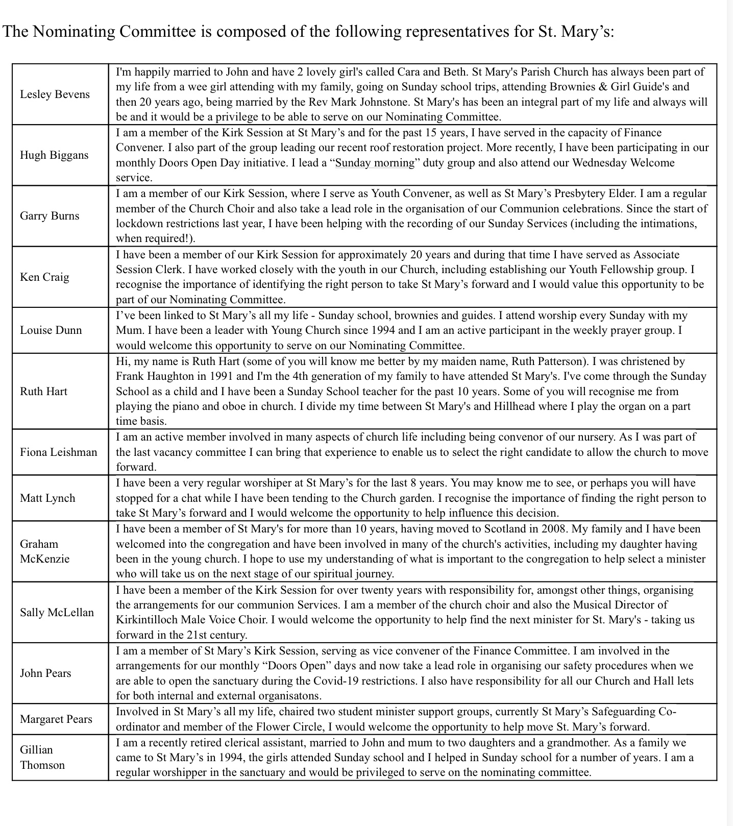 We are pleased to announce the list of members who have been elected to serve on the Nominating Committee for St. Mary’s: