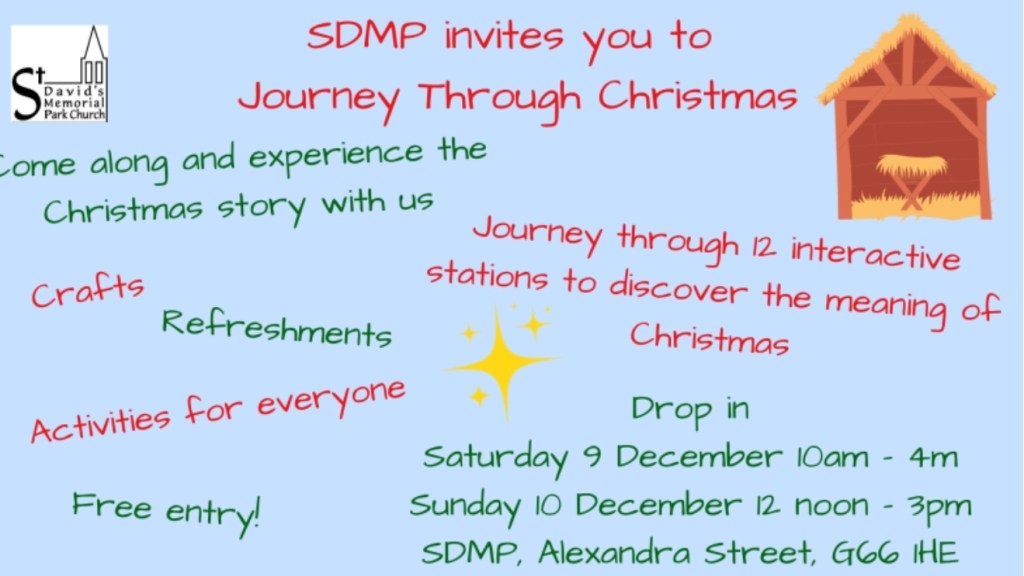 SDMP invites you to join us on Saturday 9 and Sunday 10 December for a Journey Through Christmas. Come along and explore the Christmas story through a series of interactives stations, which promise something for everyone to enjoy. Entry is free, and you’ll not only come away with a bag of Christmas, there will of course, be some festive refreshments for you too!