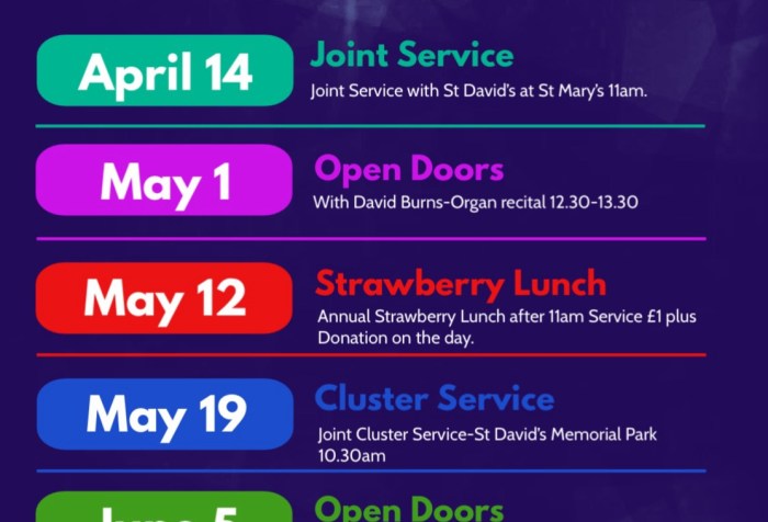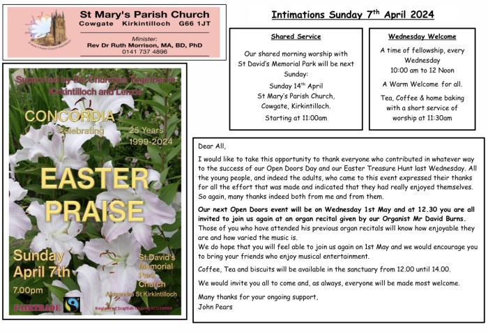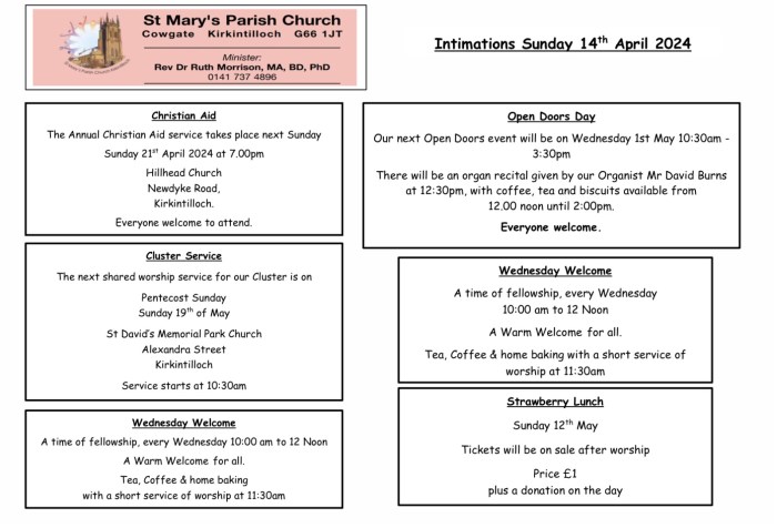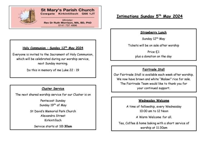 Many thanks again to all of you who have previously supported our Doors Open events and just to remind you that our next St Mary’s Doors Open day will be on Wednesday 5th June 2024, from 10.30 a.m. until 3.30 p.m.