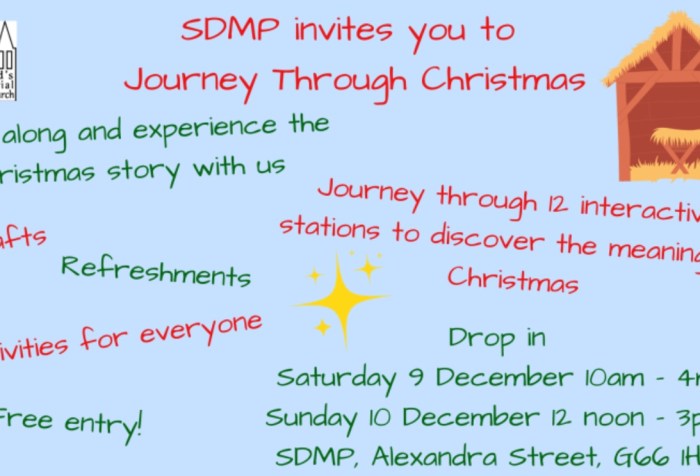 SDMP invites you to join us on Saturday 9 and Sunday 10 December for a Journey Through Christmas. Come along and explore the Christmas story through a series of interactives stations, which promise something for everyone to enjoy. Entry is free, and you’ll not only come away with a bag of Christmas, there will of course, be some festive refreshments for you too!