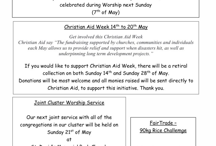 Christian Aid Week 14th to 20th May Get involved this Christian Aid Week The fundraising supported by churches, communities and individuals each May allows Christian Aid to provide relief and support when disasters hit, as well as underpinning long term development projects. If you would like to support Christian Aid Week, there will be a retiral collection today and on Sunday 28th of May. Donations will be most welcome and all monies raised will be sent directly to Christian Aid, to support this initiative. Thank you.